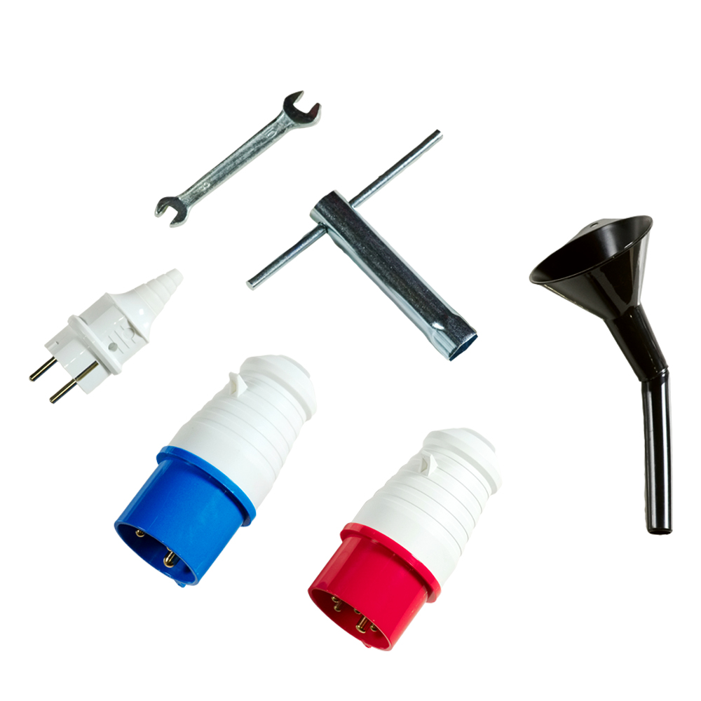 вилка 230В/32А (1 шт), вилка типа евро 230В/16А (1 шт), вилка 400В/32А (1 шт), свечной ключ с воротком (1 шт), ключ рожковый 8/10 (1 шт), ключ зажигания (2 шт), резиновая опора с крепежом (4 шт) (уже установлены на генератор) , воронка для залива масла (1 шт), инструкция с сервисным талоном и серийным номером |