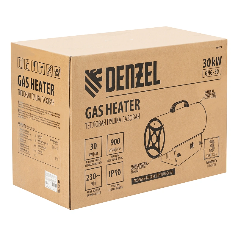 <p>Газовая тепловая пушка Denzel GHG-30 96479 мощностью 30 кВт работает на смеси пропан-бутан и выдает тепловой поток со скоростью 900 куб. м/ч. Используется для обогрева складов, цехов, гаражей, теплиц и других нежилых помещений площадью до 300 кв. м. Будет полезна на строительных площадках и в производственных помещениях.</p><h2>Преимущества</h2><ul><li>Прочность и долговечность — передняя решетка изготовлена из нержавеющей стали, стальной корпус покрыт термостойкой краской для защиты от коррозии.</li><li>Система безопасности — подача газа и электропитание будут отключены в случае перегрева или при отсутствии пламени.</li><li>Быстрый старт — для запуска тепловой пушки предусмотрен пьезоподжиг.</li><li>Экономичность — расход газа составляет 1,95 кг/ч, что позволяет реже менять баллон.</li><li>Безопасность — выключатель питания закрыт влагозащитным кожухом, задняя решетка предотвращает попадание посторонних предметов и поломку оборудования.</li><li>Устойчивость — благодаря широкой платформе пушка не опрокидывается во время работы.</li><li>Готовность к работе — сетевая вилка, газовый шланг и редуктор входят в комплект поставки.</li><li>Привлекательный внешний вид — выполненная в оригинальном дизайне пушка эффектно смотрится в помещении.</li><li>Удобная транспортировка — пушка весит 6,1 кг, а на корпусе имеется эргономичная ручка.</li><li>Гарантия 3 года — качество газовой тепловой пушки подтверждено производителем.</li></ul>