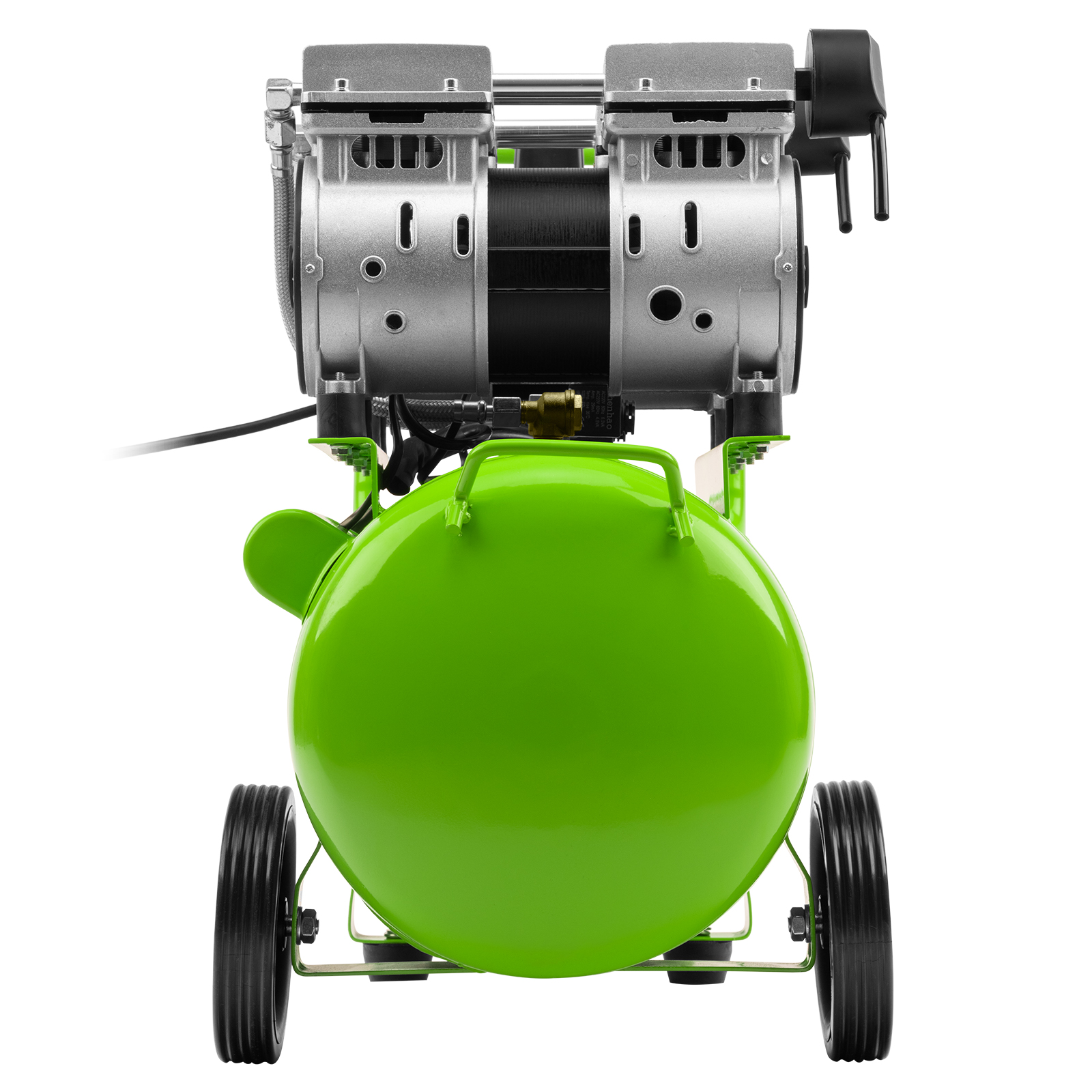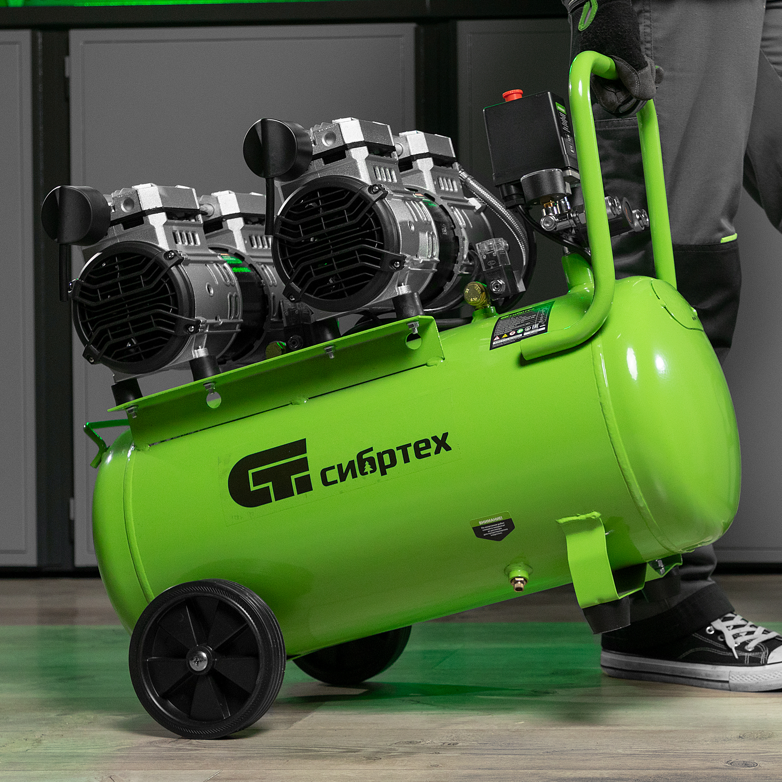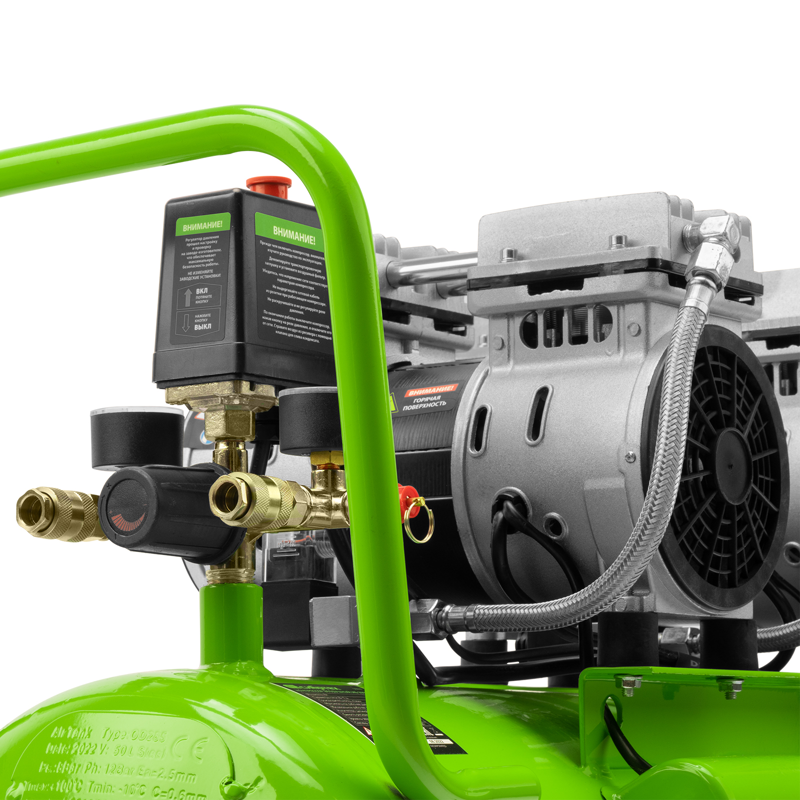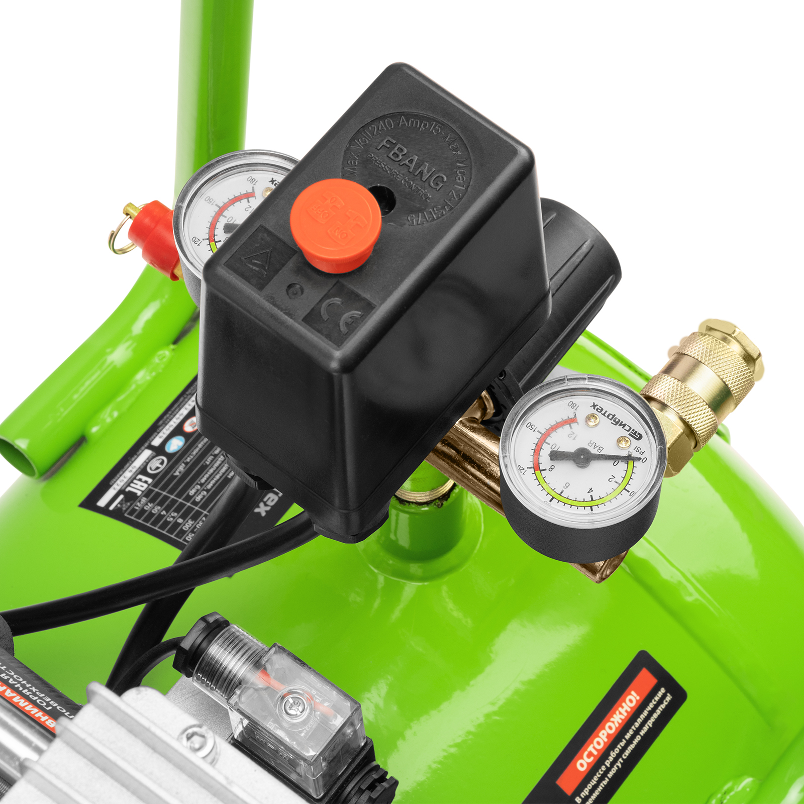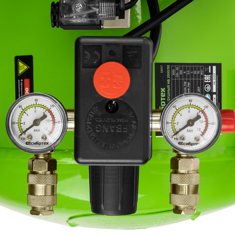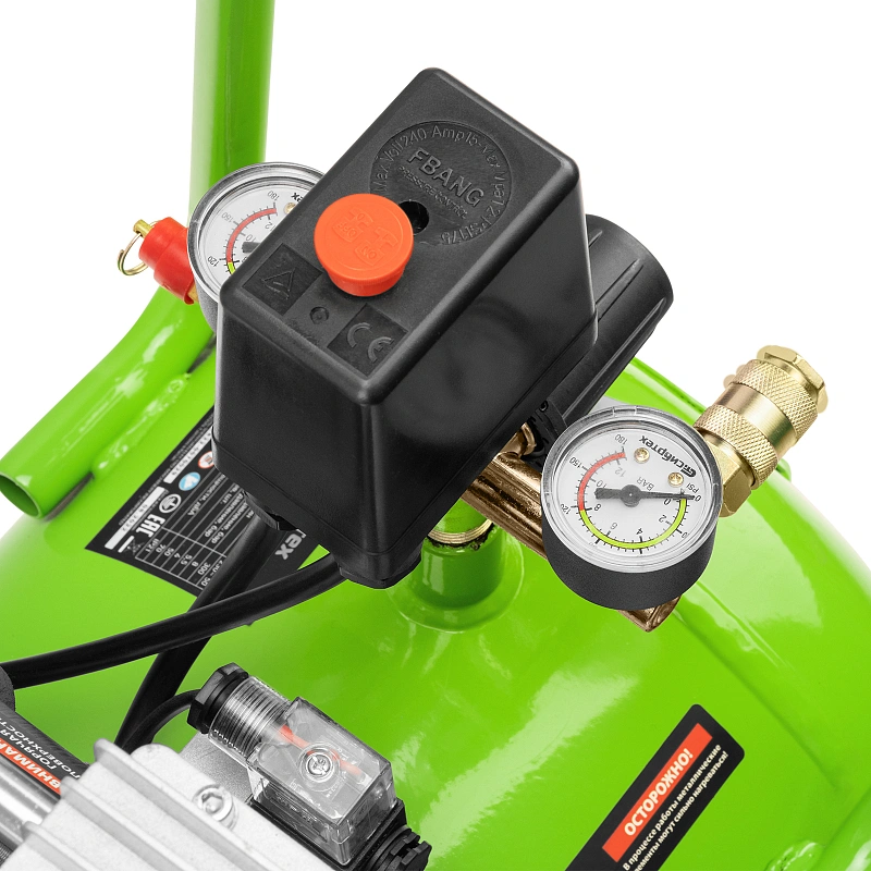 - Контроль рабочих параметров — компрессор оборудован механическим манометром для отслеживания давления.