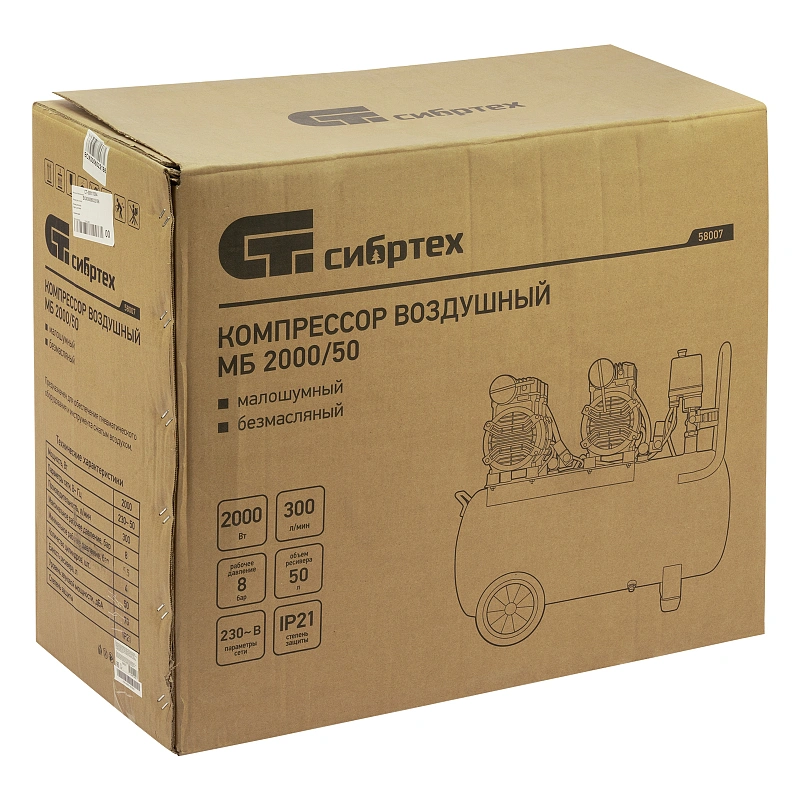 Безмасляный малошумный компрессор Сибртех МБ 2000/50 58007 мощностью 2000 Вт и объемом ресивера 50 л имеет производительность на входе 300 л/мин и сжимает воздух под давлением до 8 бар. Используется для обеспечения функционирования пневмоинструмента, например, краскораспылителя, перфоратора или пневматического шуруповерта. Для работы устройства не требуется масло, поэтому воздух на выходе не содержит его частиц. Компрессор оптимален для проведения покрасочных работ и продувки электронных компонентов.,Одна из ключевых особенностей компрессора — низкий уровень шума (не превышает 70 дБ), позволяющий использовать устройство в жилом помещении без дискомфорта для людей.
