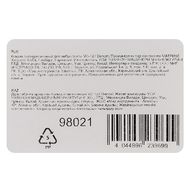 <p>Полиуретановый коврик Denzel 98021 предназначен для установки на виброплиту Denzel VC-12. Используется во время укладки тротуарной плитки. Обеспечивает бережное уплотнение на любых поверхностях.</p><h2>Преимущества</h2><ul><li>Аккуратная работа — коврик предотвращает появление сколов и трещин на плитке.</li><li>Высокий ресурс — полиуретан характеризуется эластичностью и износостойкостью.</li><li>Простая установка — особые усилия и специализированные навыки не требуются. </li></ul>