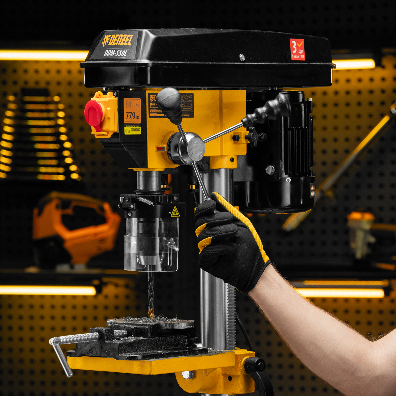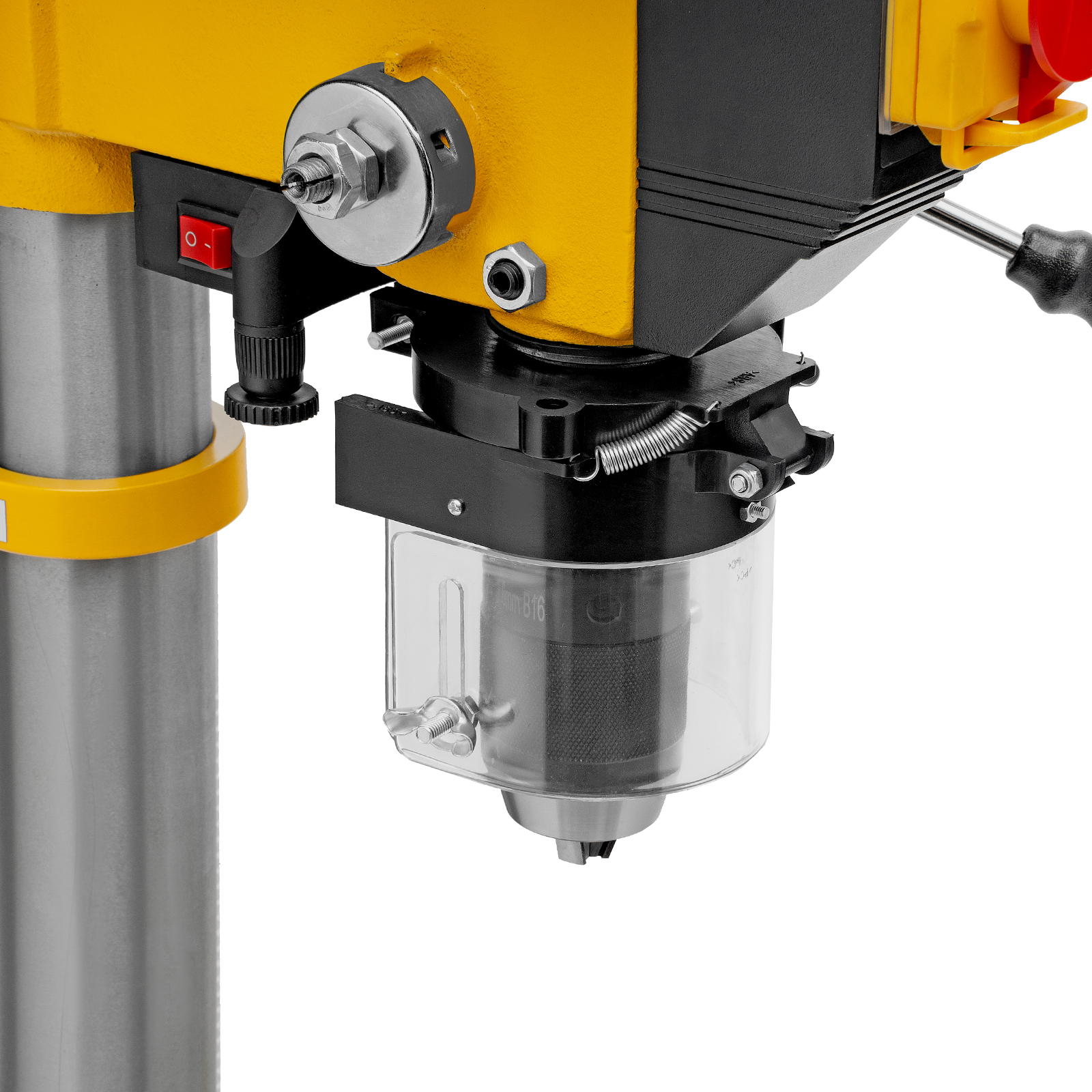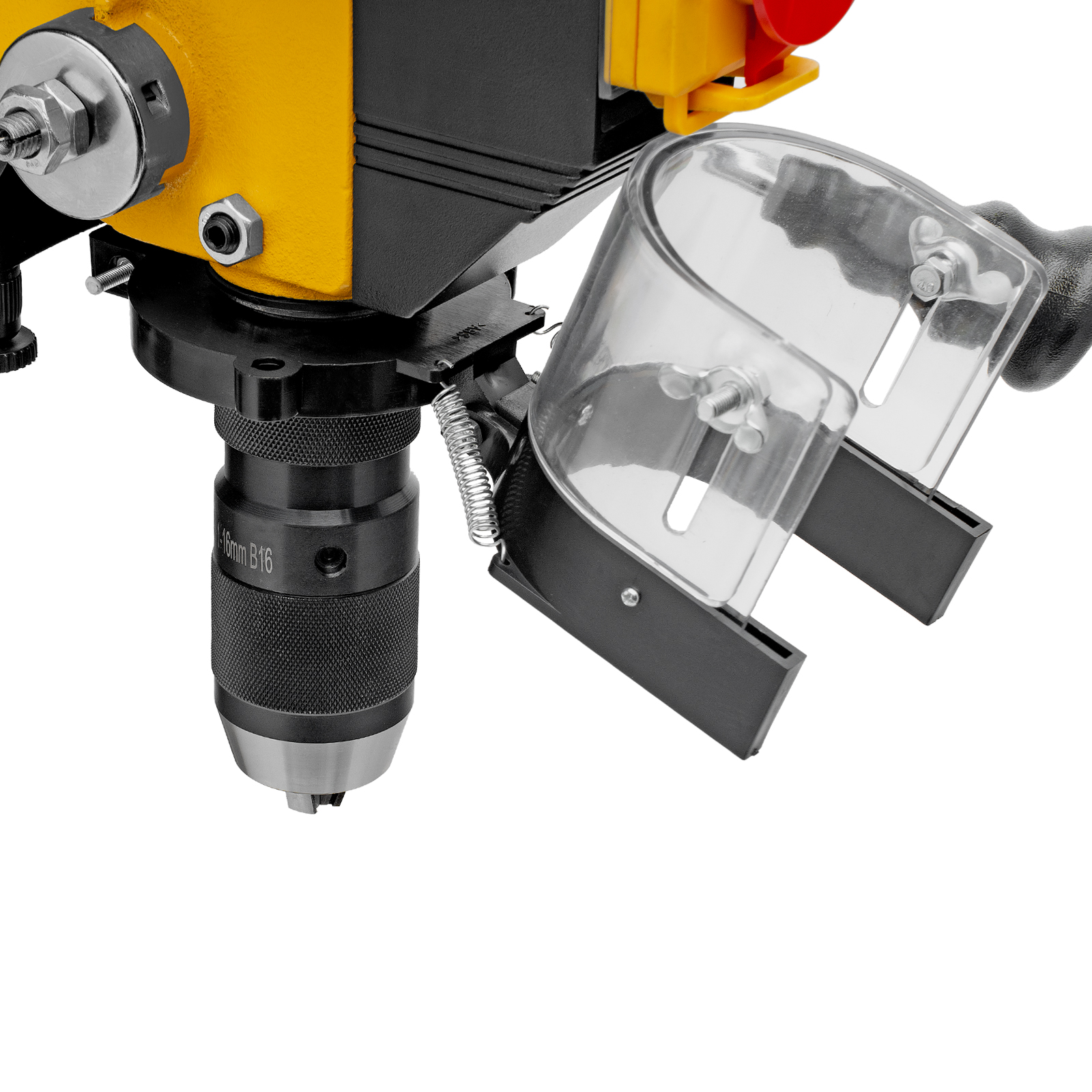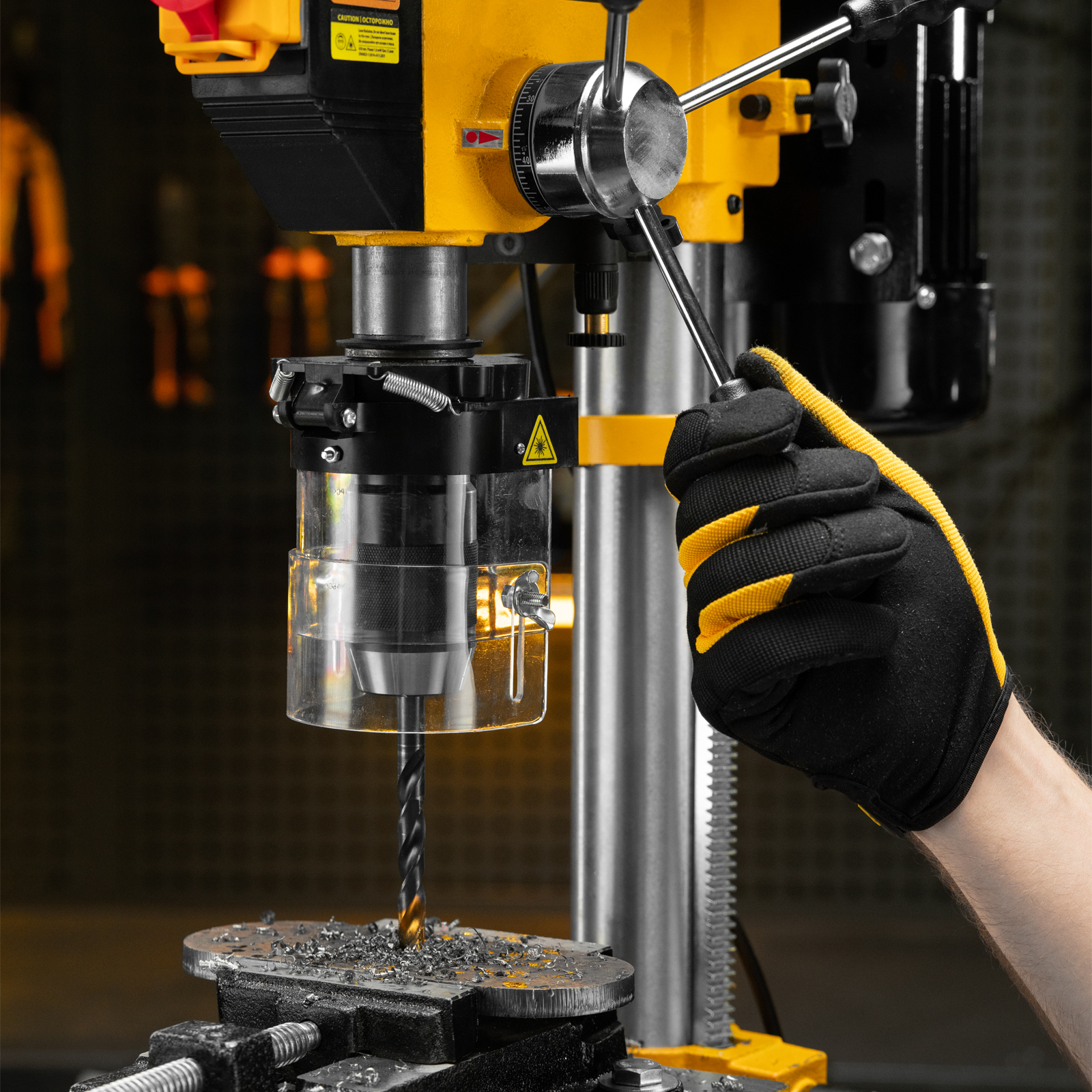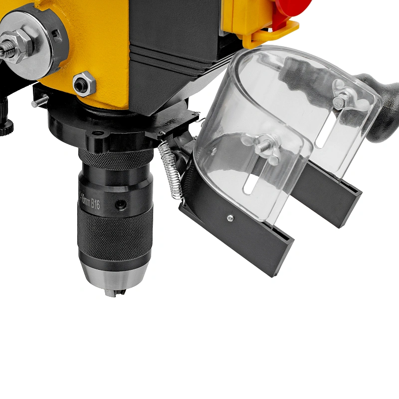 - Безопасность пользователя — прозрачный кожух защищает от вылетающей стружки во время сверления.