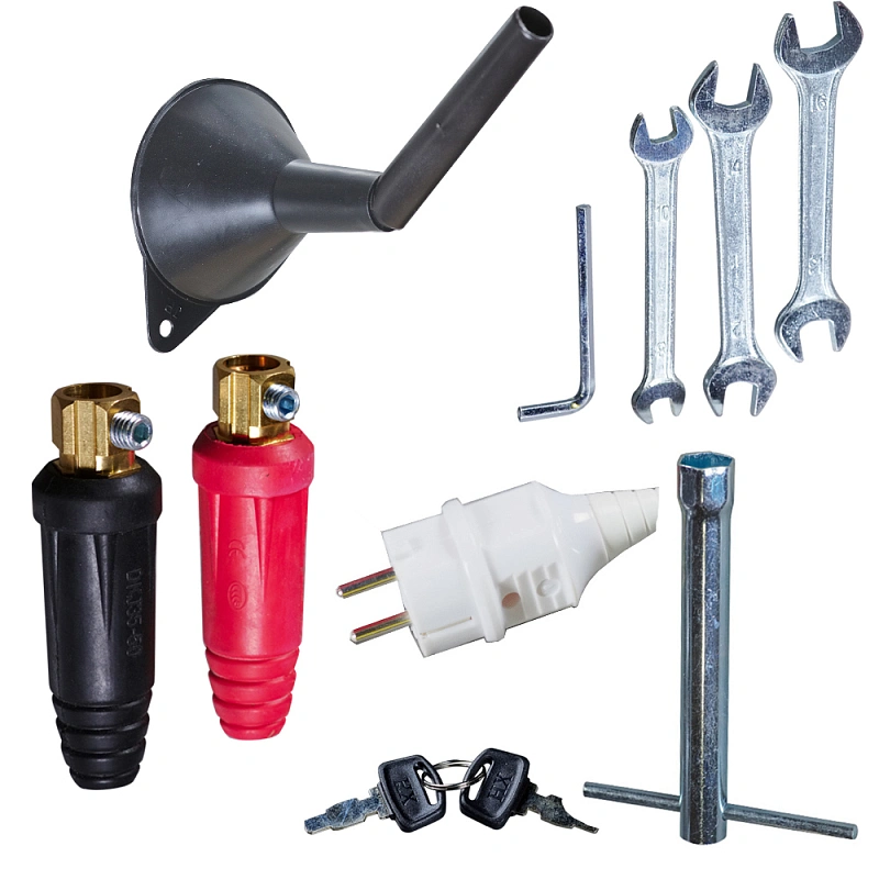 Вилка 16А/220В (1 шт), Свечной ключ (1 шт), Ключ электростартера (2 шт), Разъемы для подключения сварочных кабелей (красный 1 шт, черный 1 шт), Набор инструментов (ключи гаечные 3 шт, отвертка 1 шт), Воронка для заливки масла (1 шт) |