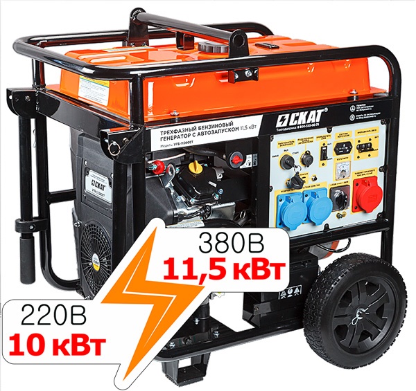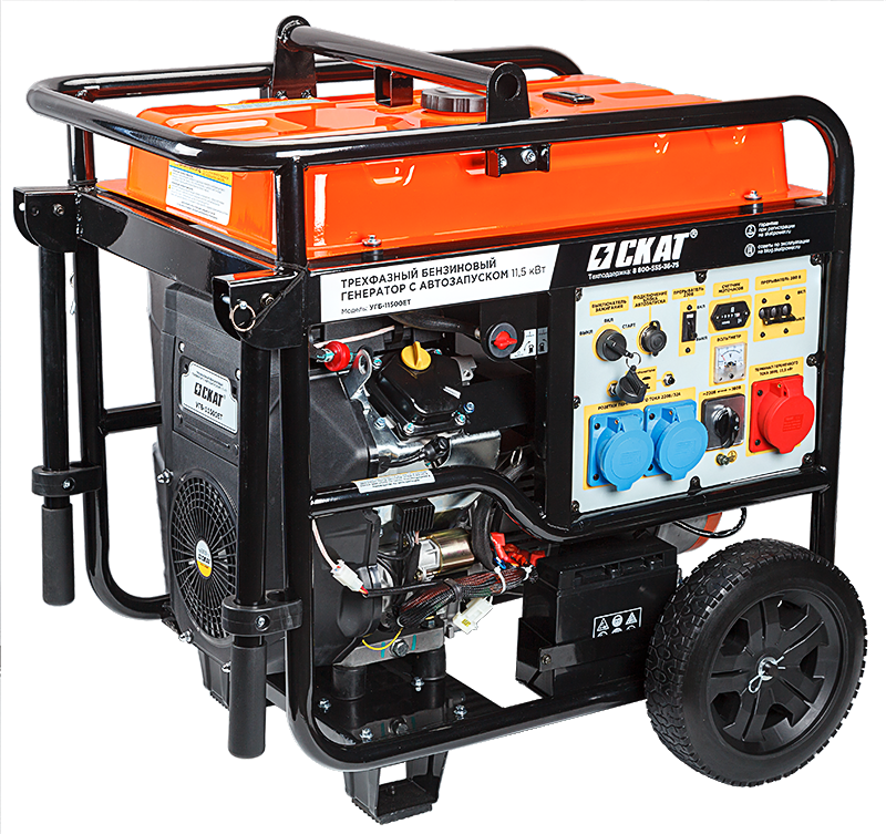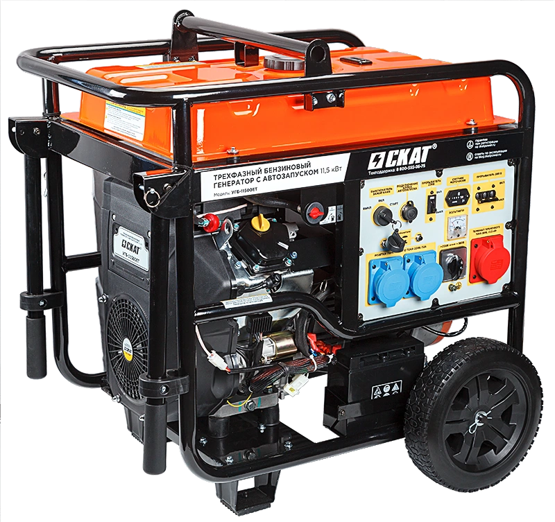 Трехфазный бензиновый генератор УГБ-11500ЕТ мощностью 11,5 кВт обеспечит электроэнергией коттедж, фермерское хозяйство, магазин, строительную площадку или даже небольшой цех. Функция электрозапуска позволяет включать генератор поворотом ключа. А блок автоматического ввода резерва АВР-11500Б запустит генератор сам, без человека!